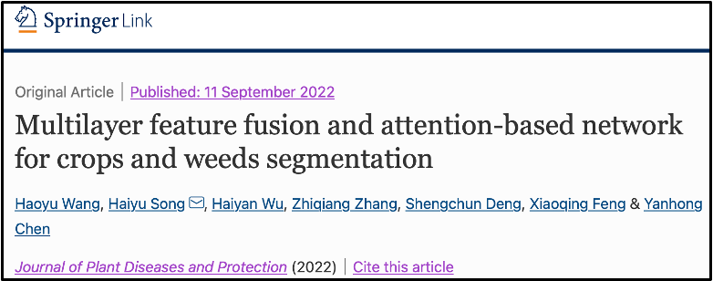 近日,我院2019级计算机1班本科生王浩宇同学在导师组宋海裕副教授和吴海燕博士的共同指导下,在JCR二区期刊《Journal of Plant Diseases and Protection》上发表了题为“Multilayer Feature Fusion and Attention-based Network for Crops and Weeds Segmentation”的研究论文。这是我院首篇以本科生为第一作者身份发表的SCI期刊论文。