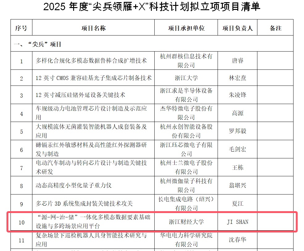 日前,浙江省科学技术厅发文公布了2025年度“尖兵/领雁+X”科技计划项目,由伟德国际bevictor1946牵头、Ji Shan博士团队申报的“‘源-网-治-储’一体化多模态数据要素基础设施与多跨场景应用平台”获浙江省“尖兵”重大科技计划项目立项。这是我校首次获批浙江省“尖兵”重大科技计划项目,彰显了我校研发攻关和科技创新综合实力的显著提升。