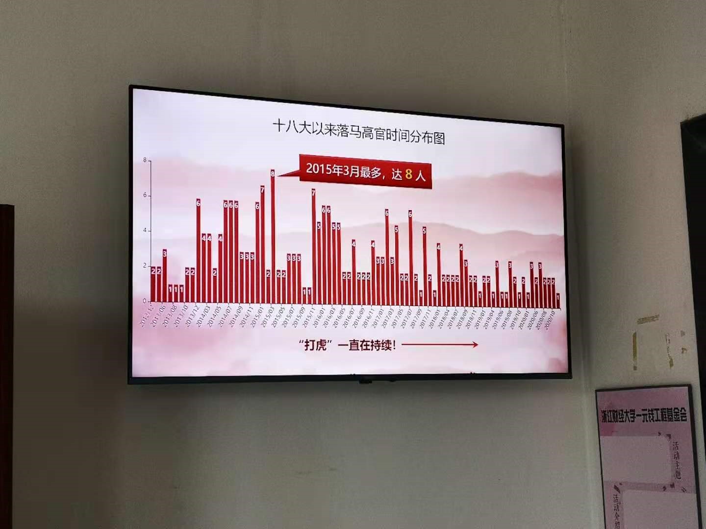 根据学院“清廉桌面”系列活动安排,学院纪委委员陈明晶老师组织师生运用数据挖掘专业知识,收集违纪警示案例,将案例数据可视化,以案明纪,提醒广大师生“手莫伸,伸手必被捉。”,警示教育展对十八大以来落马的高官和高校领导进行数据展示,提醒大家要时刻保持廉洁自律意识。