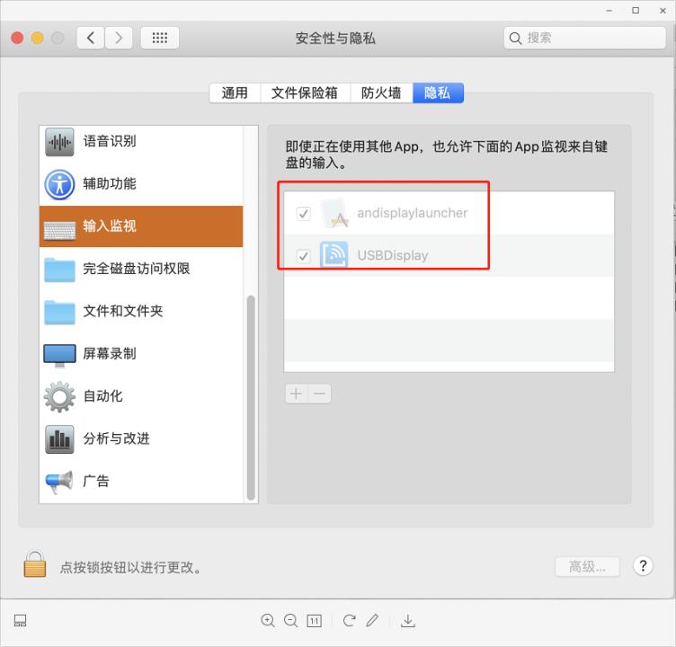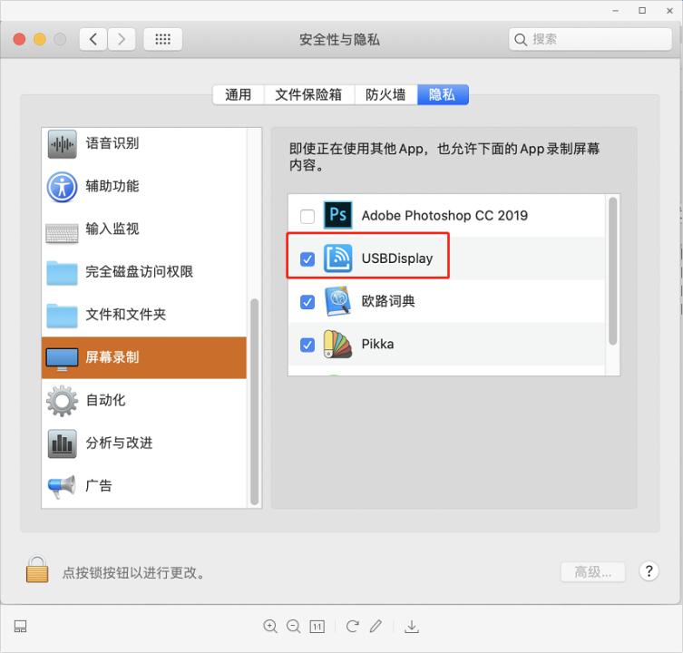 1、传屏器接入苹果电脑的USB口之后,到“安全性于隐私”里面将以下的几项提供下权限