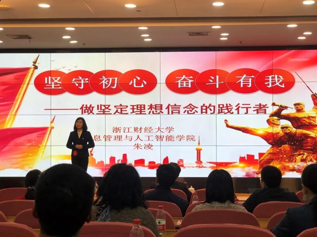 我院党员教师朱凌以《坚守初心奋斗有我——做坚定理想信念的践行者》为题进行了微党课展示。在微党课中,她通过“研”“学”“教”三个方面,向我们介绍了一群迎难而上,不畏险阻,为放飞“中国梦”而奋斗的浙财青年党员。这些平凡青年党员的奉献与担当,正是实现如今中国日益强大的关键所在。而作为党员教师的她,始终牢记党员身份,坚守立德树人的初心使命,教书育人,为脱贫攻坚、决胜小康贡献自己的青春力量。