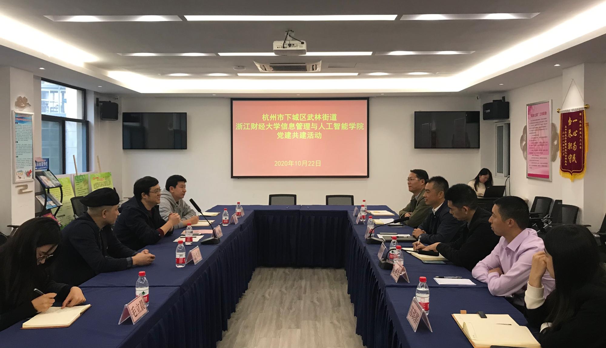 随后,双方党委在武林街道党群服务中心会议室开展了党建共建活动。信智学院党委书记徐奇伟介绍了学院的基本情况、学科优势和特色党建工作,并希望能在教工和学生两个层面,从社会实践、志愿服务、技术交流、人才合作等多方面加强与武林街道党工委的交流合作。武林街道党工委书记唐国宏介绍了街道党工委如何借助党群服务驿站,在优化“武林店小二”平台服务、疫情复产复工、民生保障服务、智慧养老服务、数字街道综合、武林非遗市集、文化家园建设和基层治理等方面推进党建引领工程。另外,学院与会党员老师还就人才培养、社会服务、宣传和团委等工作与武林街道党工委副书记梅育生,武林街道党建办主任、机关党总支书记梁艳生和武林街道团委副书记苏琪骅展开了交流。