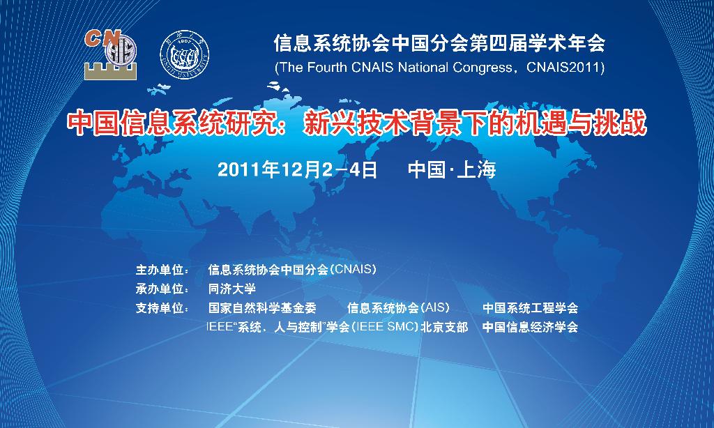 12月2日-4日,信息系统协会中国分会CNAIS在上海成功举办了第四届全国大会(CNAIS2011),会议由同济大学承办,主题为“中国信息系统研究:新兴技术背景下的机遇与挑战”。我院信息管理系齐峰老师应邀参加了会议。来自全国信息管理与信息系统领域或与此相关领域的专家、学者等近300人出席了本次大会。与会代表共聚一堂,围绕“新兴技术背景下的机遇与挑战”主题,就随着全社会范围内信息技术应用的不断渗透和深化,以灵活感知为特征的物联网/传感网技术、以3G 为代表的移动通讯技术、以泛在为特征的云计算等新技术不断涌现并迅速兴起的背景下,现代企业组织面临着新一轮的挑战和机遇,企业应用和行业动态上也呈现出明显的新趋势和新特征。对此,国内外学者进行了广泛而持续的探索,取得了一系列极具学术价值和实践指导意义的研究成果。