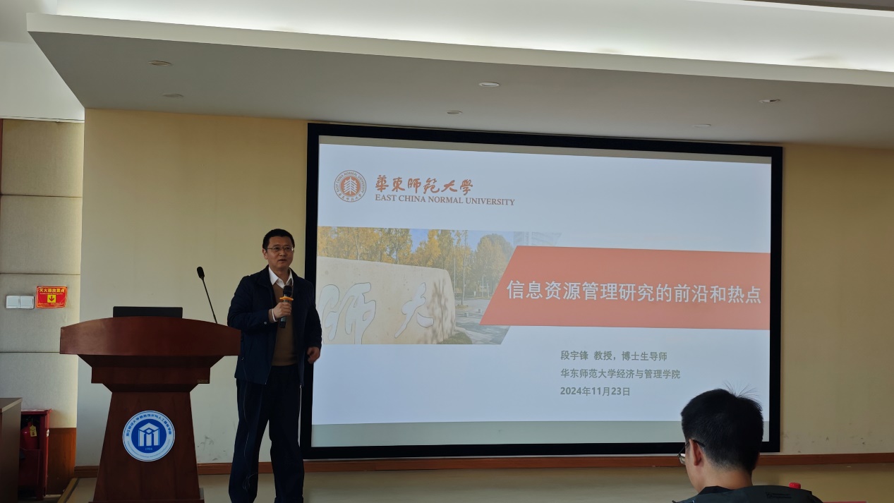 2024年12月2日,华东师范大学经济与管理学院教授、全国图书情报专业学位研究生教育指导委员会委员段宇锋应邀来我院交流,并作题为《信息资源管理学科的研究热点》的学术讲座。学院科研院长林剑教授、图书情报专业相关教师隆清琦教授、刘维树副教授、王婉茹博士等热情接待并作深入交流。