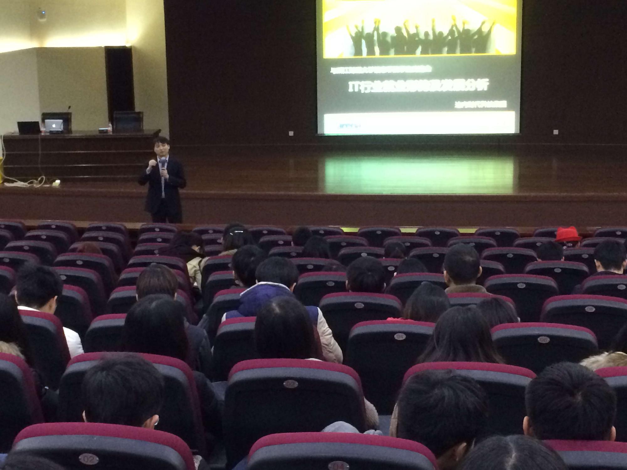 韩潇老师一到场就受到了全场同学的热烈欢迎,同学们对IT行业的现状及就业前景表现出了浓厚的兴趣。韩潇老师基于大量的数据图表分析,开门见山指出当前各行各业的就业压力非常大,但IT行业却“风景这边独好”。韩老师还特别提醒同学们要正确看待自己的专业发展,他强调“在如今的信息社会,软件、计算机等信息类专业是最有竞争力和就业前景的专业。阿里巴巴、浙大网新、恒生电子等知名IT企业都落户杭州,对软件开发人才的需求量很大,同学们可以在这些企业得到很好的历练”。最后,韩老师提醒同学们作为一名IT人才一定要有长远的目光,在校学习期间千万不能只拘泥于书本上的知识,同时也要课余涉猎更多的专业新知识,特别要关注移动互联网的发展动向,为日后的职业发展奠定坚实的基础。