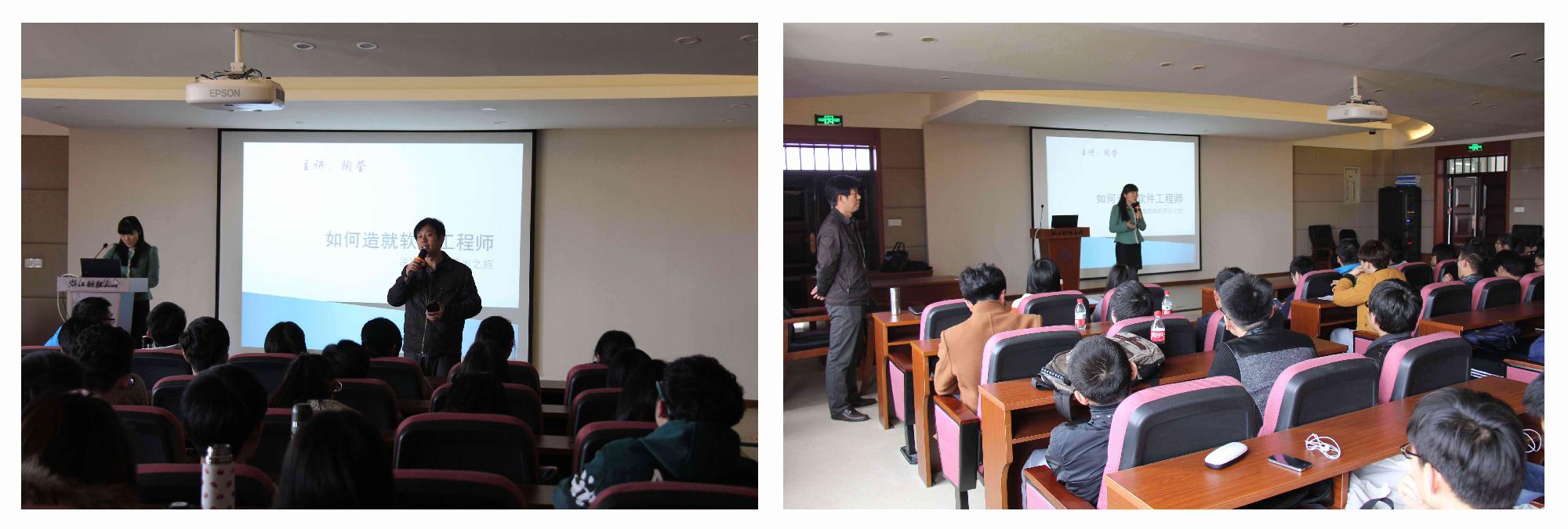 为加强我院与校外实践基地的合作,深化实践教学改革,激发学生专业兴趣,15年3月23日下午杭州归谷实训基地技术经理陶莹老师应邀在信息学院302教室为同学们带来了一场神奇的软件开发之旅。副院长张帅教授主持并全程观摩了此次授课。