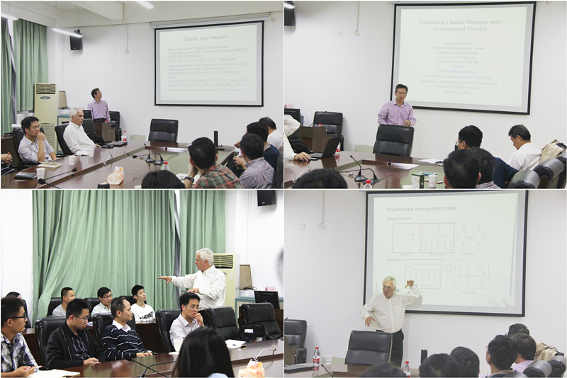 10月12日下午,加拿大康考迪亚大学约翰·摩森商学院的Gregory E. Kersten教授和加拿大温莎大学Odette商学院的Kevin W. Li教授在我院404会议室为我院师生分别带来题为“Auctions and Negotiations: Models, Systems, and Behavioral Studies”和“Distribution Channel Strategies under Environmental Taxation”的学术讲座。信工学院近30余名科研骨干、研究生参加了本次讲座。
