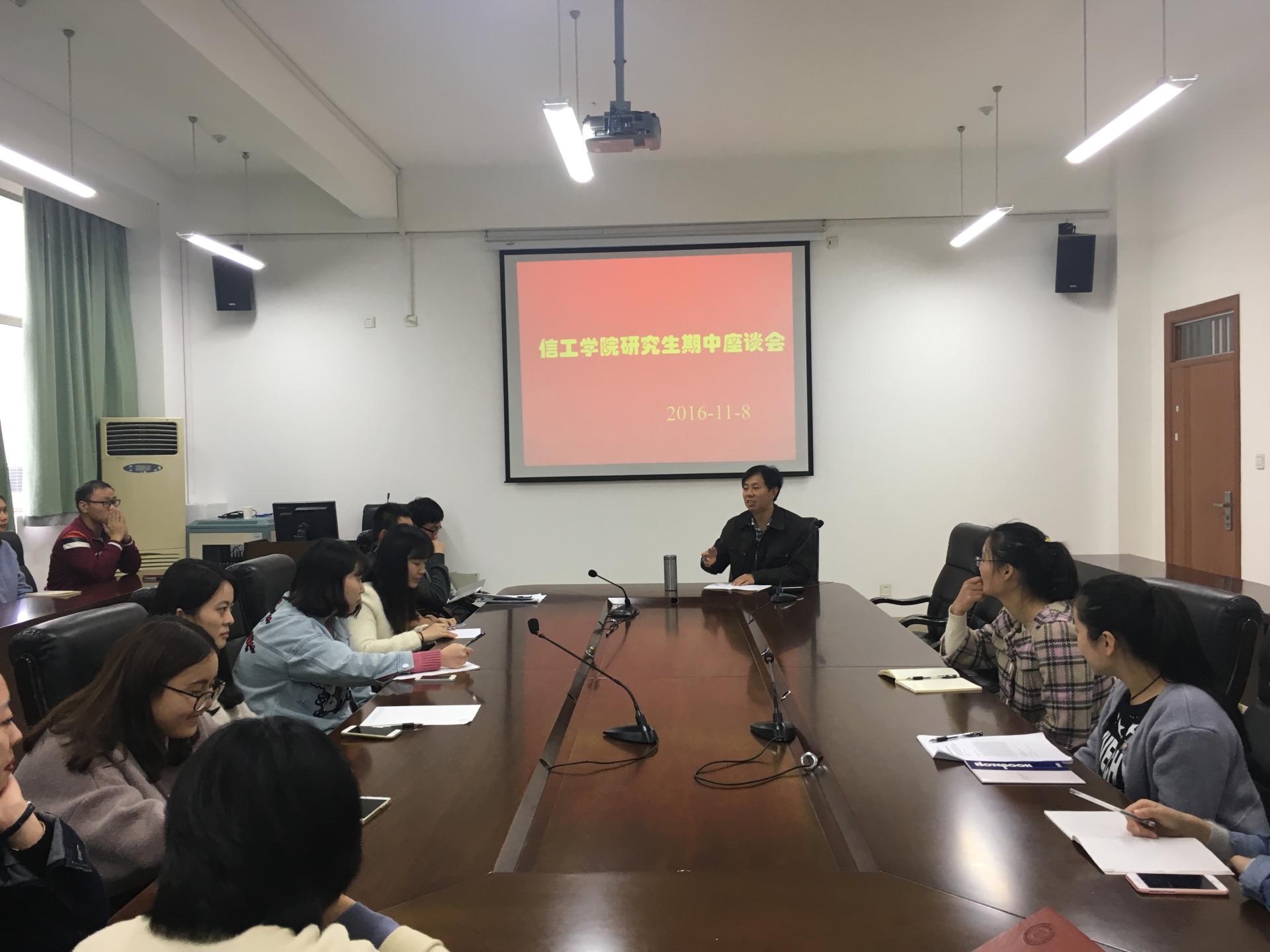 11月8号下午,我院在学院404会议室举行了2016-2017学年第一学期研究生期中座谈会。学院副院长张帅老师、研究生辅导员及学院二十余名研究生参加了此次座谈会。座谈会上,张帅老师首先询问了在座研究生的学习、生活以及论文进展情况,并对大家的学习以及论文发表寄予厚望,希望研究生能充分利用好课余时间,多阅读文献,特别是英文文献,争取早日发表质量较高的论文。随后张帅老师对研究生关于论文研究方向、课程设置、奖学金评定规则等方面的问题做了详细解答。通过这次期中座谈会,学院进一步了解了学生的学习和生活进展,研究生也进一步明确了自己今后的努力方向。