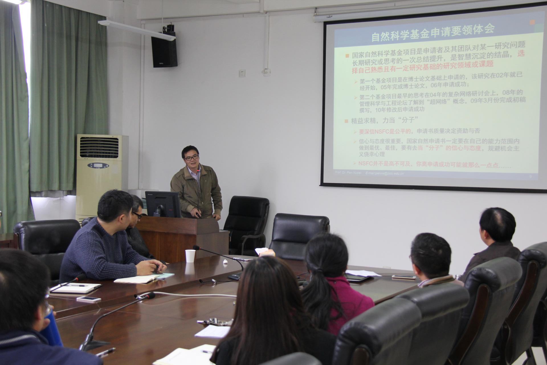 为进一步推动我院教师对国家自然科学基金项目申报的热情,提高科研项目申报的命中率,学院于11月10日下午14:00在学院楼404会议室举行了2017年国家自然科学基金申报动员、辅导会。浙江理工大学经济管理学院副院长潘旭伟教授应邀以“自然科学基金项目申请体会与提纲解析”为主题分享了国家自然科学基金的申报经验。学院及兄弟学院约20名科研骨干教师参加了本次动员、辅导会。