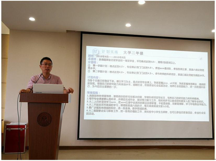 2018年6月5日下午13:30,信息系部联合教工第一支部在学院楼302报告厅举行了2017级新生学业规划大赛,同时邀请了部分导师与新生见面,展开座谈。
