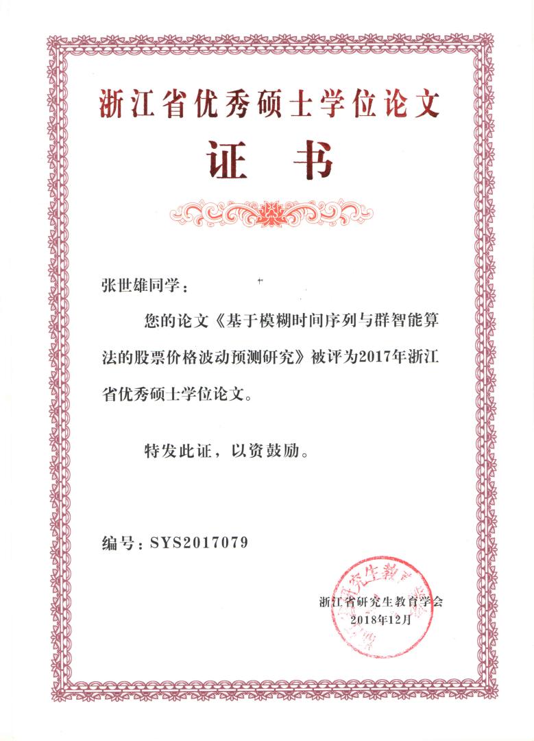 近日,浙江省研究生教育学会发文公布了2017年浙江省优秀学位论文评选结果。我院管理统计学专业2014级硕士毕业生张世雄的硕士学位论文《基于模糊时间序列与群智能算法的股票价格波动预测研究》被评为2017年浙江省优秀硕士学位论文。此次评选共评出21篇优秀博士学位论文,94篇优秀硕士学位论文,我校共有3篇硕士学位论文入选。这是继2016年我院企业管理专业2013级研究生张雪扬首次获得省优秀硕士学位论文后,我院研究生再次获得此项荣誉。
