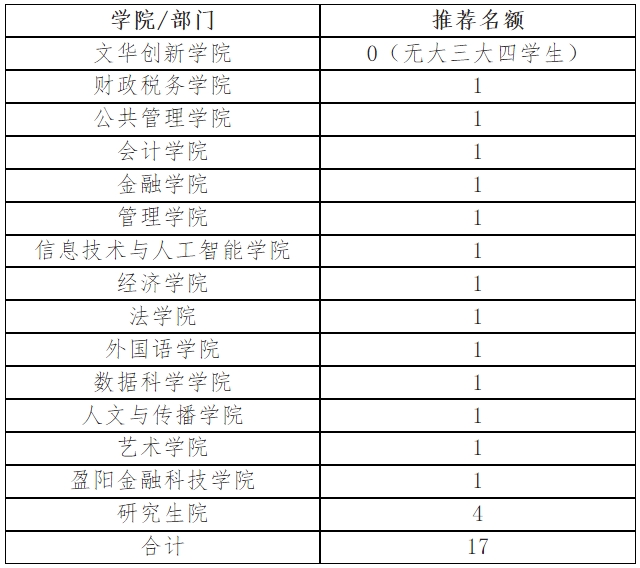 全校范围内以各学院、各部门为单位进行推荐,推荐名额如下表(研究生候选人由研究生院组织申报与初评,具体申报名额与材料上交时间由研究生院另行通知)。