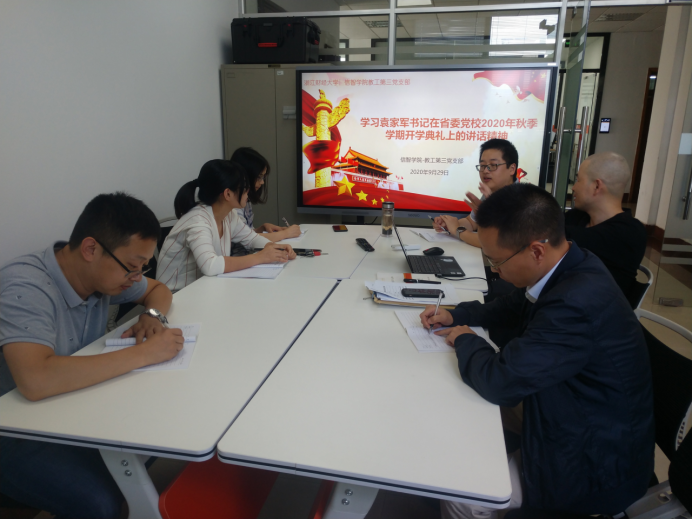 20209月29日,信息管理与人工智能学院教工第三党支部在9301D召开主题学习会,学习省委书记袁家军在省委党校2020年秋季学期开学典礼上的讲话精神,会议由支部书记杨水清主持,支部成员参加。