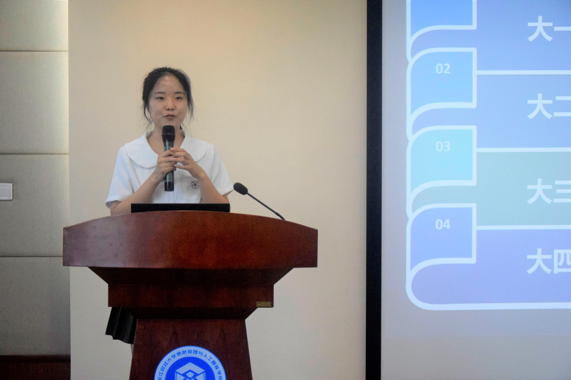 随后,19软件2韩书焕和19信息1黄倩两位同学向21级学弟学妹分享了自己大学四年的学业规划过程和考研经历。如何选择考研专业、学校和地区?何时开始备考?每个阶段可以做哪些事?从哪里获得有用的考研资讯和资料?大二大三阶段有哪些学习建议?围绕这些问题,两位同学将自己的经验倾囊相赠。