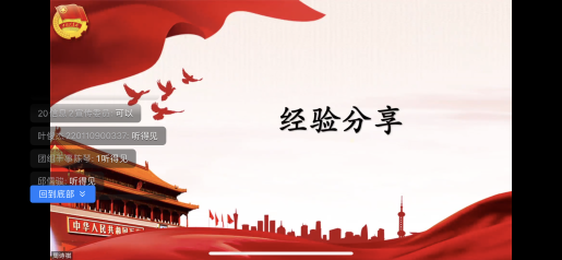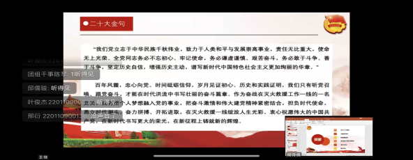 首先,王佳同学向我们介绍二十大精神,并说明如何更好地将二十大阐述的各种先进理念融入我们的日常生活之中,使各位团干部能够以身作则,将二十大精神内化于心,外化于行。