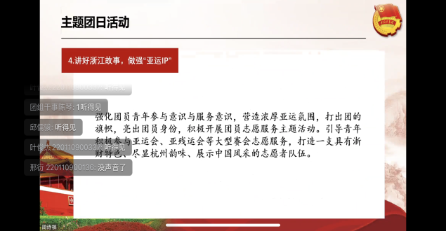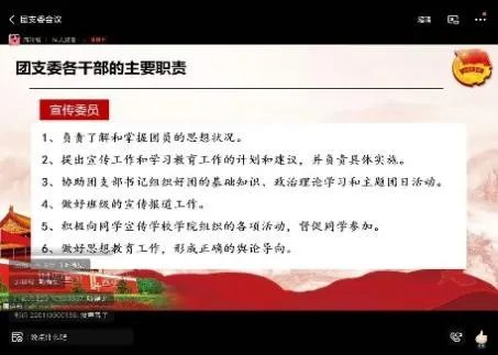 其次,学院团委副书记周诗祺向我们介绍应如何开展智慧团建系统的操作要求,并明确了团支委干部的主要职责,使各委员可以各司其职,使班级团务工作开展顺利。并指出青年大学习的收交要求及活动必要性。对后期如何更好的开展三会两制一课进行指导,强调规范各团支部的推优流程,尽快完成各团支部推优小组的建设,希望各团员干部以饱满的热情和责任建设团支部。希望通过此次团支委会议,加强各团员干部的思想建设,提升团员干部的工作能力,为我校共青团工作新局面奠定良好基础。