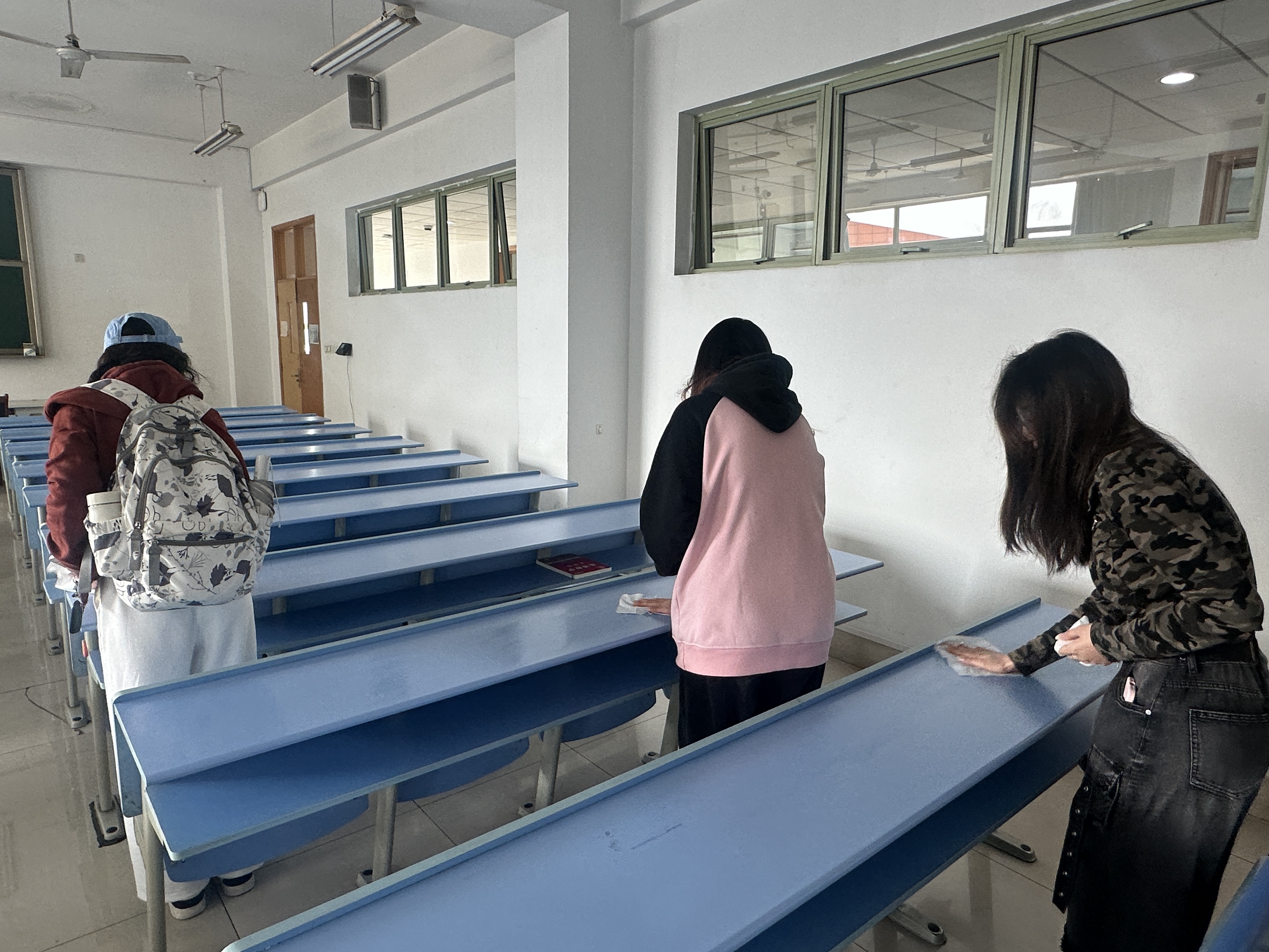 活动当天,部门志愿者们按既定分工迅速投入劳动,开展卫生专项整治。大家认真清扫地面残留纸屑尘土,擦拭课桌椅凳,维护黑板、讲台等公共教学设施,并对学长学姐们遗留的备考资料、学习设备统一收纳,温馨提醒及时领取。活动中,有说有笑,各组成员各司其职、协同高效,充分展现出团结协作的精神风貌。