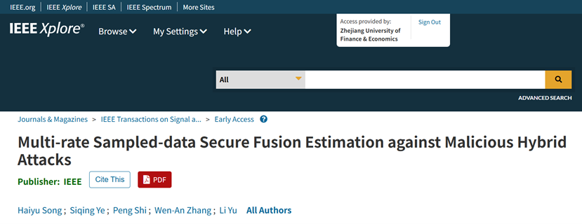 近日,我院2021级人工智能3班本科生叶思卿同学在宋海裕教授的指导下,在IEEE Transactions汇刊《IEEE Transactions on Signal and Information Processing over Networks》上发表了题为“Multi-rate Sampled-data Secure Fusion Estimation against Malicious Hybrid Attacks”的研究论文(导师一作、学生二作)。