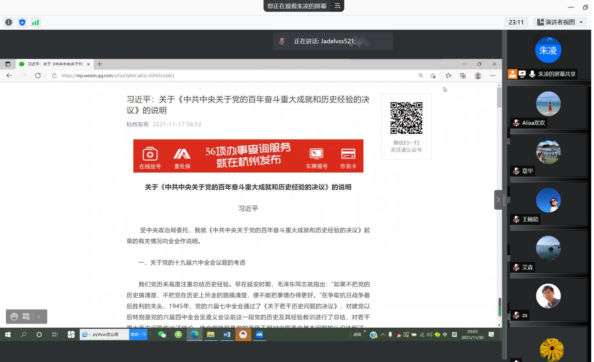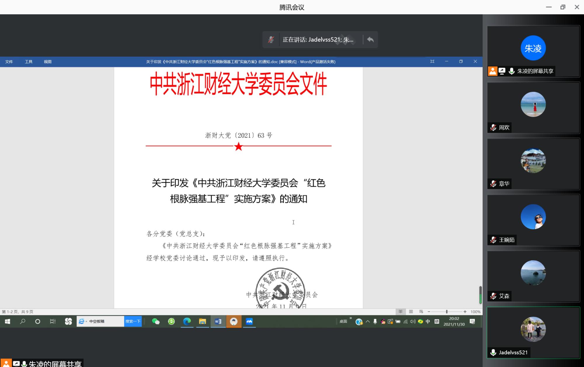 2021年11月30日,信智学院教工第一党支部召开第一议题制度专题研究的线上学习会。学院院长张帅及支部党员参加会议,会议由支部书记朱凌主持。支部党员集体学习贯彻全省基层党建工作会议精神、谋划实施“红色根脉强基工程”的政策举措,以及党的十九届六中全会精神。