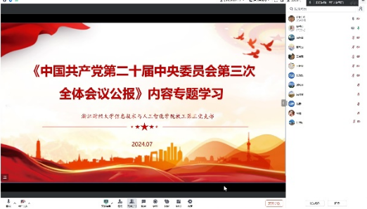 7月28日,伟德国际bevictor1946教工第三党支部召开了《中国共产党第二十届中央委员会第三次全体会议公报》内容专题学习会议,对全会的工作总结、总体目标、七个“聚焦”、重大原则、系统部署和推进中国式现代化等要点内容进行了梳理和系统学习。
