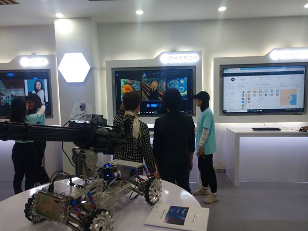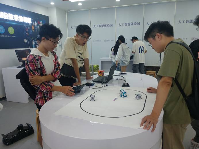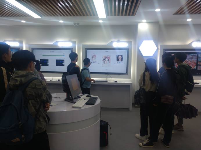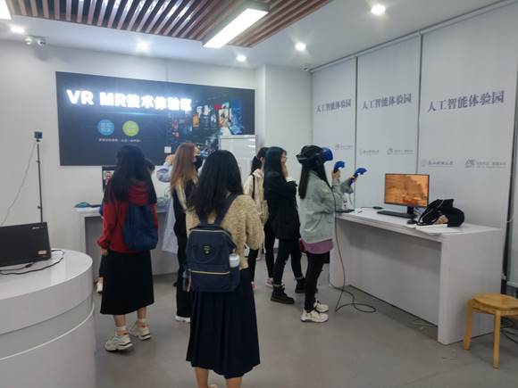 在教育部“AI+智慧学习”共建人工智能学院和中央财政资助项目“人工智能AI+应用创新实验室”的支持下,2019年我院在创业学院楼1楼西建设人工智能体验园,占地面积204平方,设备价值近120万元。目前,人工智能体验园由视频展示介绍区、机器感知区、互动体验区、机器执行区、虚拟现实区、综合应用区和互动体验区等六部分构成。拥有语音识别演示系统、视频融合演示系统、人脸融合展示系统、图像风格转移系统、可视化神经网络演示系统、六轴视觉机械臂、人机对弈棋盘、车载视觉防卫系统、激光雷达车载套件、虚拟现实解决方案、增强现实解决方案、互动编程试验箱等设备。