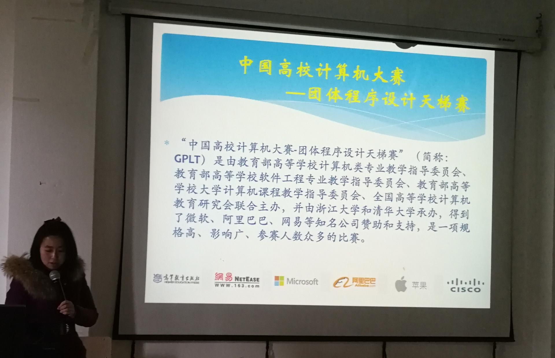 教练朱凌老师主持了宣讲会,介绍了“中国高校计算机大赛——团体程序设计天梯赛”的赛制和比赛注意事项,以及我校在前两届天梯赛中斩获的辉煌战绩,并为我校在2017年天梯赛中获奖的同学颁奖。