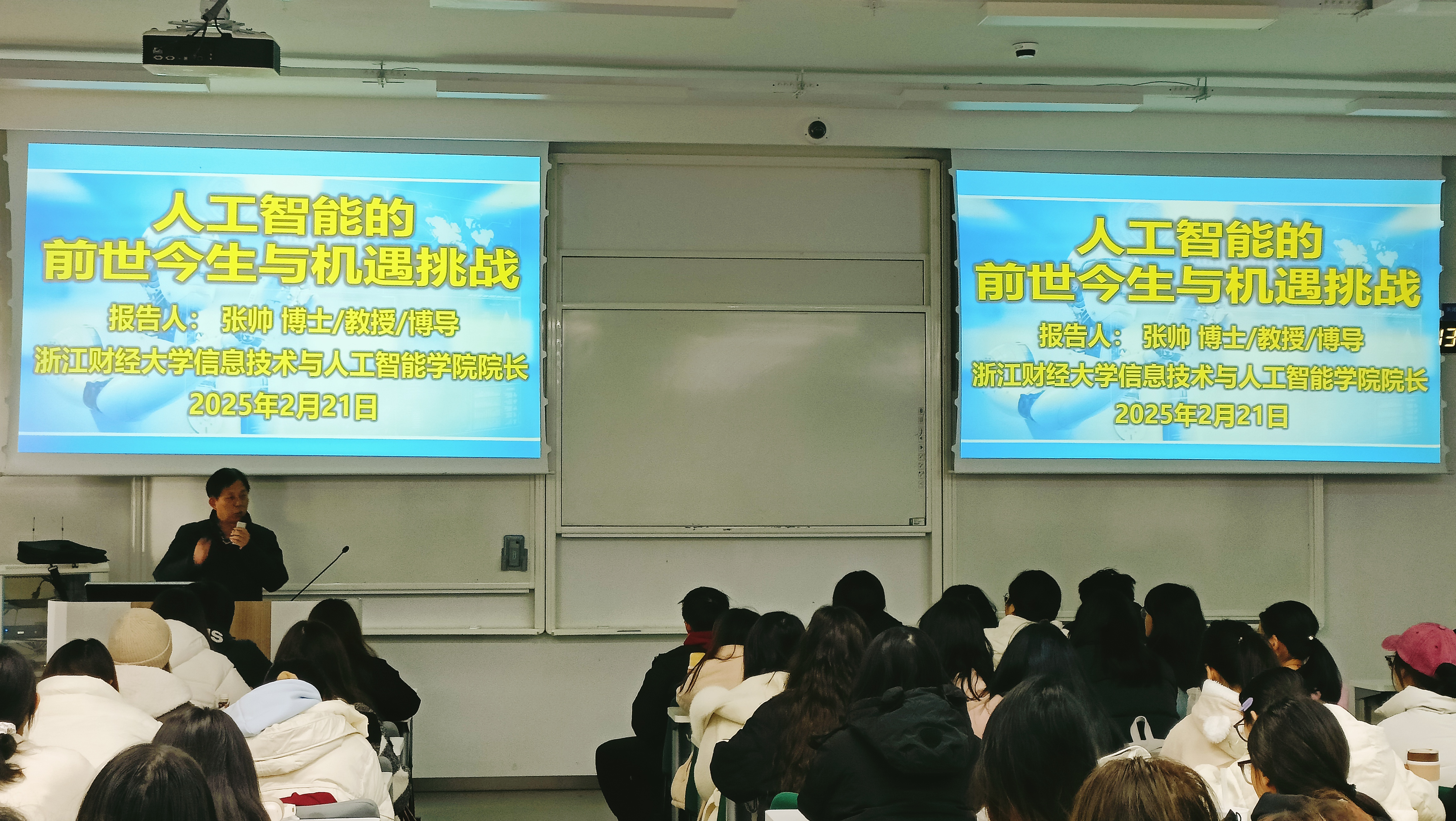 2025年2月21日,在学校的高度重视,教务处的积极推进下,伟德国际bevictor1946全新打造的全校人工智能通识课《人工智能导论》正式开讲。首堂课由信智学院院长张帅教授主讲,吸引了财政税务学院、会计学院、经济学院、金融学院、管理学院、公共管理学院、数据科学学院、人文与传播学院、外国语学院、艺术学院、文华创新学院、盈阳金融科技学院等全校12个学院不同专业的学生踊跃参与,课程组全体教师到场观摩学习。本次课程的开办标志着学校在深化教育教学改革、推进人工智能通识教育方面迈出重要一步,彰显了学校对培养跨学科复合型人才的高度重视。