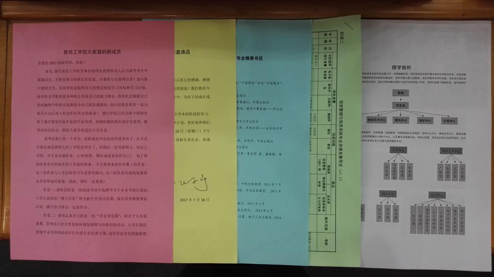 近日,随着招生录取工作的进行,我院已向全国各地录取于信息管理与工程学院的新生寄发通知书,包括《录取通知书》、《信工学院2017级新生家长会邀请函》、《致信工学院大家庭的新成员》、《伟德源自英国始于19462017级新生入学指南》、《信工学院2017级新生各专业推荐书目》、各专业的《专业多维发展导览》以及《团学组织》等一系列材料。各份材料旨在帮助新生们建立入学事项、学院组织、专业情况、师资团队等内容的初步了解,落实暑期注意事项及各专业暑期作业,以增强新生对学院及专业的热情度和积极性。其中,我院提前建立各专业QQ群,并将群号、公众号、官网地址等信息附于材料内,由各班级班导、专业辅导员热情解答新生们的问题,进一步增强师生之间的联系。