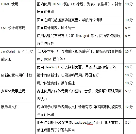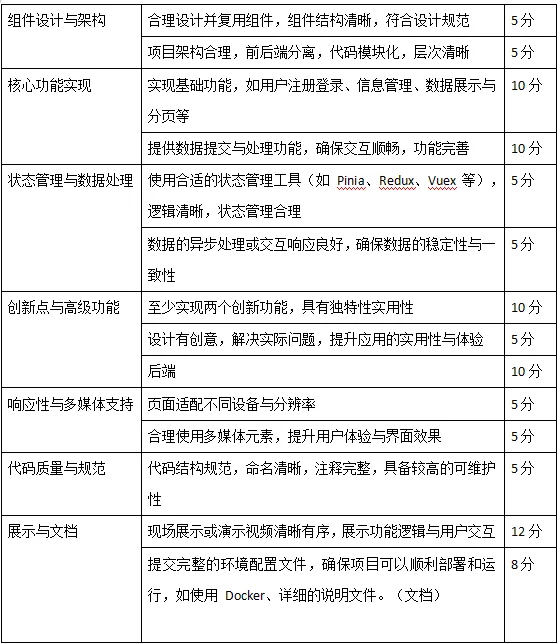 以个人单位完成,录制视频展示(重点介绍下表中打分点对应的功能)并书写文档介绍。作品完成后,上传压缩包至邮箱压缩包内需包含项目代码、功能说明文档和演示视频,文件命名格式为“学号+姓名+班级”。