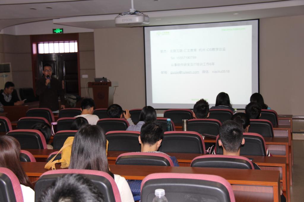 郭杰老师用幽默的语言、精彩的互动从一个逻辑小问题开始,引导大家进入讲座主题,介绍了自己以及一些iOS开发者喜欢从事此项开发的几大原因。随后,向同学们展示了一些生活中常见的并且短期能够开发案例,激发同学们学习的兴趣,鼓励大家进入到iOS开发的队伍中来。郭杰老师的讲座为我院学生呈现了一场精彩纷呈的教学盛宴。最后汇文教育提供免费6天短期培训的机会,让学生进入到实践中感受一下iOS开发。