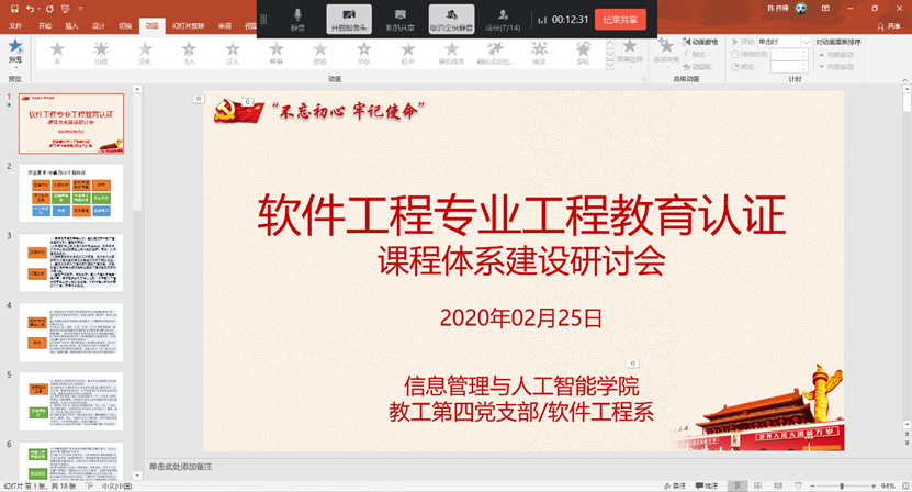 225日上午,我院软件工程专业召开了工程教育认证课程体系建设工作会议。受疫情的影响,本次会议采用线上会议的方式进行。会议由陈伟锋老师主持,软件工程专业课程体系相关任课教师参加本次会议。本次会议的研讨主题是课程体系建设工作中教学大纲的修订,包括课程目标的制定机制、课程目标对毕业要求的支撑关系分析、教学内容的适应调整、以及课程目标达成度计算方法等。经过上一学年对三门基础必修课程的试点建设工作的论证和分析,我们逐步掌握了工程教育工作中课程体系环节相关工作内容和机制,因此,本次会议将启动第二轮全面的课程体系建设工作。