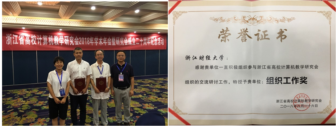2018年8月16日,由浙江省高校计算机教学研究会主办、浙江大学城市学院承办的2018年浙江省高校计算机教学研究会学术年会暨研究会成立二十周年纪念活动在杭州举行。我院张文宇、王竹云林剑、冯小青四位老师参加了此次教学年会。在本次年会上,我院参会教师发表了题为《多维任务驱动下财经类院校计算机基础课程改革与实践研究》和《软件工程与实践教学的实施》两篇教学研究论文。此外,由于我院长期以来积极参与浙江省高校计算机教学研究会组织的交流研讨工作,在本次研究会成立二十周年纪念活动中被授予组织工作奖。