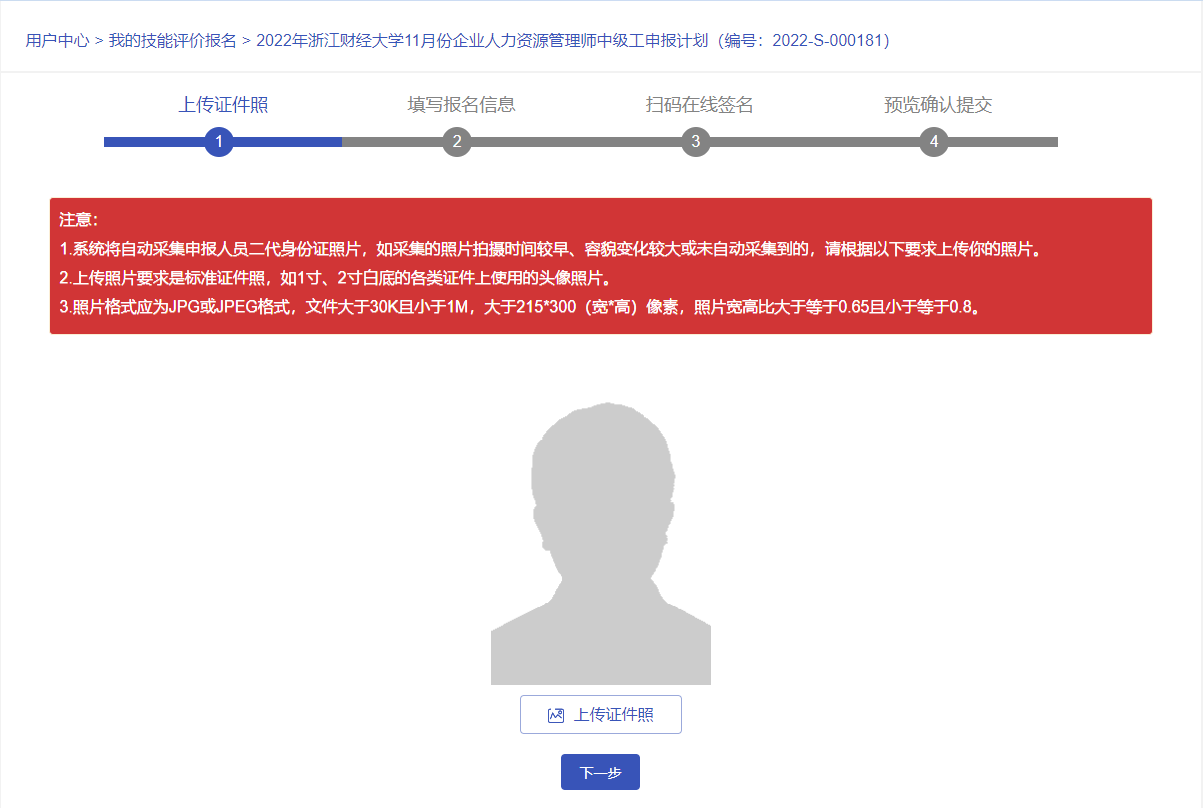 注:系统会自动采集申报人员的二代身份证照片;如果没有自动采集成功,请考生上传本人证件照,证件照需要满足界面红色区域中的第2和第3点要求。