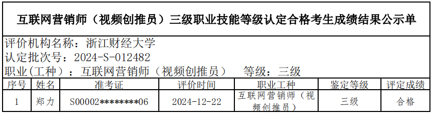 六、关于编号:2024-S-012482互联网营销师(视频创推员)三级职业技能等级认定成绩合格人员结果公示单