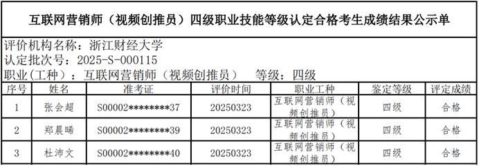 五、关于编号:2025-S-000115互联网营销师(视频创推员)四级职业技能等级认定成绩合格人员结果公示单