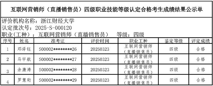 二、关于编号:2025-S-000120互联网营销师(直播销售员)四级职业技能等级认定成绩合格人员结果公示单