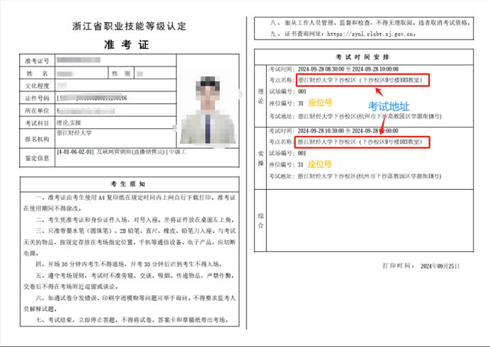 注: 1.考点名称即为考试教室,请注意查看教室编号及座位号,对号入座。